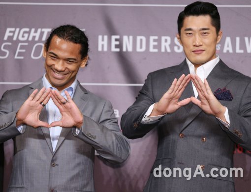 파이터 벤 헨더슨(왼쪽)과 김동현이 8일 오전 서울 중구 반얀트리 클럽앤스파 크리스탈 볼룸에서 열린 UFC Fight Night 서울티켓오픈기자간담회에 참석해 포토타임을 하고 있다