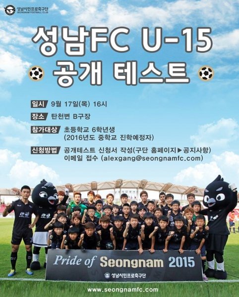 모집대상은 초등학교 6학년생(2016년도 중학교 진학예정자)으로 축구에 대한 열정과 재능을 가진 학생이라면 누구나 참여 가능하다. 테스트 참가를 원하는 학생은 성남FC 홈페이지 공지사항에서 신청서를 다운받아 작성한 뒤 이메일로 접수 가능하며 접수 마감은 9월15일(화) 오후 8시까지다.