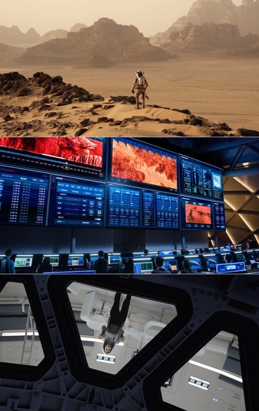 마지막으로 마크 와트니의 동료들인 아레스 3 탐사대가 머물고 있는 우주 공간 장면 촬영도 빼놓을 수 없다. ‘인터스텔라’ ‘그래비티’에서 선보였던 공포심이 느껴질 정도로 광활한 우주 공간. ‘마션’은 여기에 우주 비행사들이 생활하는 인간적인 느낌을 우주정거장에 담았다. 행성들간 반사되는 빛 속에서 끊임없이 따뜻한 빛이 들어오는 정거장의 느낌이 아레스 3 탐사대의 팀워크를 대변하는 듯 한다. 이 촬영은 ‘그래비티’와 마찬가지로 헝가리, 영국에 있는 대형 세트장에서 진행 되었다.