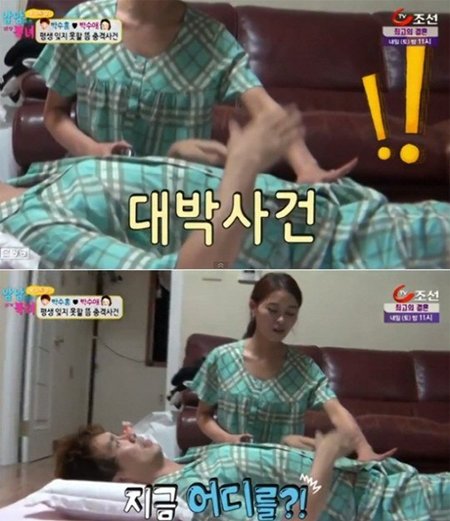 박수홍은 바닥에 가지런히 누웠고 박수애는 뜸을 놓기 위해 배에 손을 올려놓았다. 그런데 바로 이 순간 박수홍이 벌떡 일어나며 당황한 표정을 지어 박수애를 놀라게 했다. 사연인 즉슨 박수애의 손이 박수홍의 중요 부위에 살짝 닿았던 것.