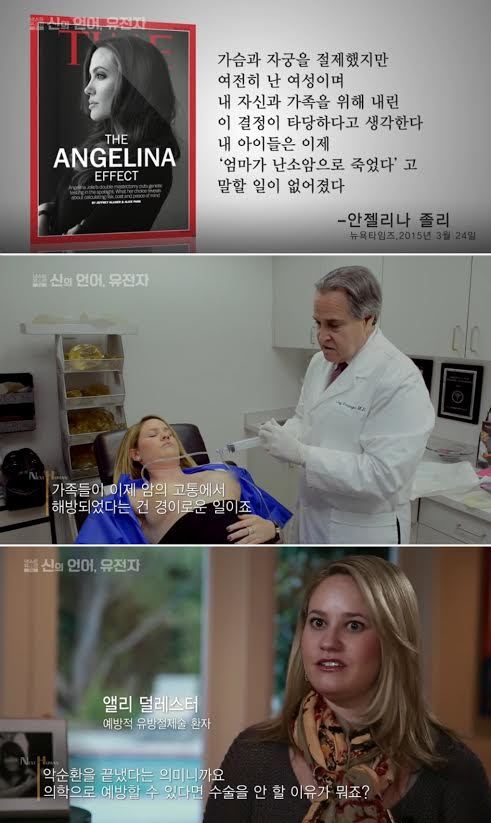 2015 KBS 대기획 ‘넥스트 휴먼(The Next Human)’이 배우 안젤리나 졸리가 받았던 예방적 유방절제술을 다룬다. 유전자 분석 기술의 발달이 예방 의학에 미친 영향을 다루기 위해 미국의 20대 여성 케이스를 독점 취재했다.