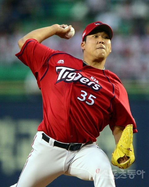 10일 서울 잠실야구장에서 ‘2015 타이어뱅크 KBO 리그’ 두산 베어스와 기아 타이거스의 경기가 열렸다. 1회말 기아 선발 임준혁이 힘차게 공을 던지고 있다.