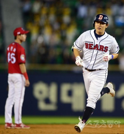 10일 서울 잠실야구장에서 ‘2015 타이어뱅크 KBO 리그’ 두산 베어스와 기아 타이거스의 경기가 열렸다. 3회말 2사 3루 두산 정수빈이 기아 선발 임준혁을 상대로 선제 투런홈런을 친 후 베이스를 돌고 있다.