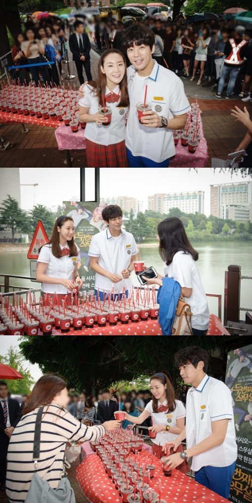 이와 함께 이들은 이날 저녁 8시 30분에 방송되는 ‘두번째 스무살’ 본방 사수 독려도 잊지 않았다. 캠퍼스에 등장한 늦깎이 대학생 ‘하노라’역의 최지우와 츤데레 매력의 까칠 교수 ‘차현석’역 이상윤의 깜짝 선물에 많은 대학생들과 시민들은 반가움을 감추지 못했다. 점심식사 후 졸음을 잊게 하는 시원한 아이스커피와 배우 최지우, 이상윤의 밝은 미소에 시민들은 배우들에게 먼저 파이팅을 외치며 힘찬 응원을 전했다.