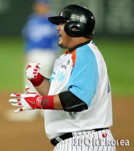 11일 오후 부산 사직야구장에서 열리는 ‘2015 타이어뱅크 KBO 리그 프로야구’ 롯데 자이언츠 대 삼성 라이온즈 경기 1회말 1사 2,3루에서 롯데 최준석이 1타점 적시타를 친 후 환호하고 있다.