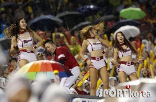 11일 오후 잠실야구장에서 열린 `2015 타이어뱅크 KBO 리그 프로야구` 두산 베어스와 KIA 타이거즈의 경기에서 KIA 3회초 공격 2사 1,2루 4번 필 타석 때 우천 중단이 선언된 가운데 KIA의 치어리더가 빗 속에서 흥겨운 응원전을 펼치고 있다.