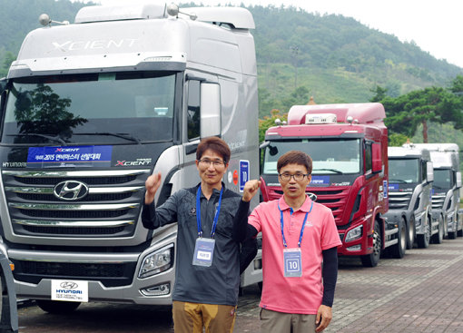 현대자동차는 11∼12일 1박2일간 ‘엑시언트 연비 마스터 선발대회’를 진행했다. 대회 시작에 앞서 참가자들이 차량 앞에서 선전을 다짐하며 포즈를 취하고 있다. 사진제공|현대자동차