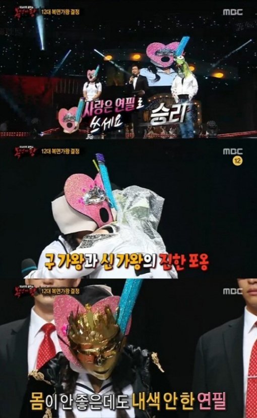 새 가왕에 등극한 연필은 "내가 무대 위에서 많이 까불었지만 솔직히 대기실이랑 무대 뒤에서는 계속 아파서 화장실을 왔다 갔다 했다"며 "그런 모습은 보여드리기 싫어 노력했다"고 소감을 밝혔다.