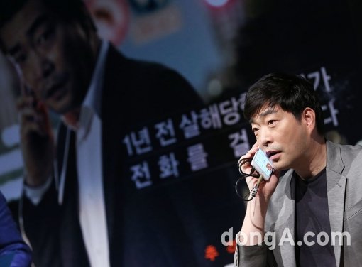 손현주가 14일 오전 서울 강남구 압구정 한 멀티플렉스에서 열린 영화 ‘더 폰’ 제작보고회에 참석해 전화연결을 하고 있다.