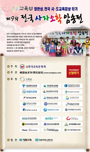 이번 9회 대회는 지난 8회 대회보다 훨씬 많은 약 480여 명의 입상자들에게 전체 대상인 교육부장관상을 비롯해 전국 17개 시·도교육감상, 한국표준협회장상, 한국교육문화회이사장상 등이 주어진다. 시·도별 개최 시간과 장소 등 보다 자세한 정보는 한국교육문화회 홈페이지(www.hanjapass.com)를 참조하면 된다.