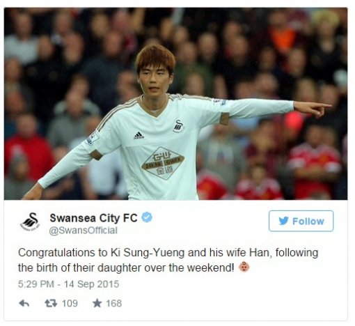 잉글랜드 프리미어리그(EPL) 스완지시티가 구단 SNS를 통해 미드필더 기성용(26)의 득녀 축하 메시지를 전했다.