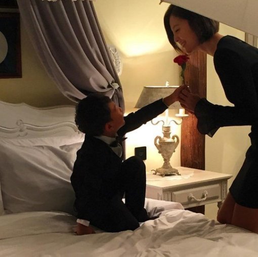 사진 속 김성은의 아들 정태하 군은 엄마에게 빨간 장미꽃 한 송이를 건네주고 이 장미를 받은 엄마 김성은은 누구보다 행복한 표정을 짓고 있다.