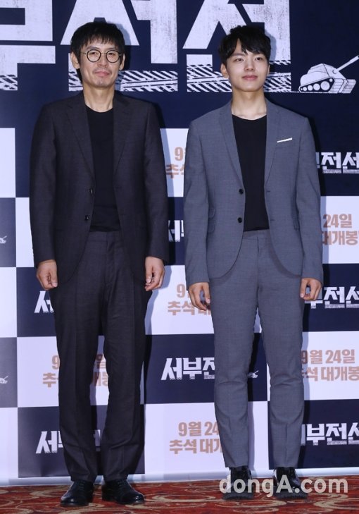배우 설경구(왼쪽), 여진구가 15일 오후 서울시 광진구 건대입구 롯데시네마에서 열린 영화 '서부전선' 언론시사회에 참석해 기자간담회를 하고 있다.