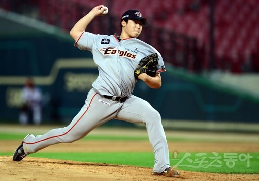 15일 광주 KIA챔피언스필드에서 ‘2015 타이어뱅크 KBO리그’ KIA 타이거즈와 한화 이글스의 경기가 열렸다. 한화 선발투수 김민우가 힘차게 볼을 던지고 있다.