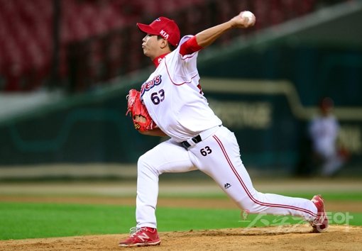 15일 광주 KIA챔피언스필드에서 ‘2015 타이어뱅크 KBO리그’ KIA 타이거즈와 한화 이글스의 경기가 열렸다. 1회초 2사 1, 2루에서 KIA 임기준이 구원등판해 볼을 던지고 있다.