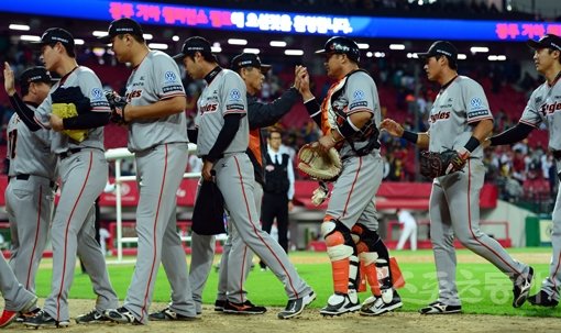 15일 광주 KIA챔피언스필드에서 ‘2015 타이어뱅크 KBO리그’ KIA 타이거즈와 한화 이글스의 경기가 열렸다. 한화가 KIA에 7-3으로 승리한 뒤 선수들이 김성근 감독의 격려를 받고 있다.