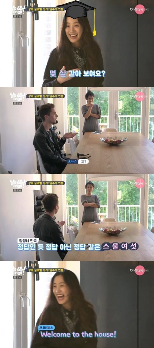 이어 놀란 정려원은 자신의 나이가 몇으로 보이는 지 물었고, 토마스는 “스물 여섯 살 같다”고 대답했다. 이에 30대인 정려원은 함박 웃음을 지으며 “입주를 환영한다”고 외쳐 웃음을 자아냈다.