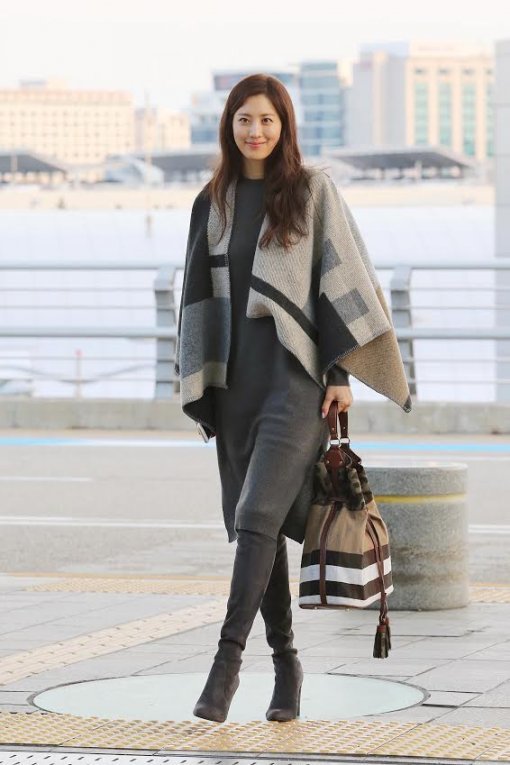 늘씬한 키가 돋보이는 수현은 그레이 니트 드레스와 체크 프린트 판초, 롱 부츠로 포근하고 편안한 룩을 연출하고, 여기에 카무플라주 가죽 트리밍이 돋보이는 체크 캔버스 백으로 포인트 줘 편안하면서도 우아한 공항 패션을 선보였다.