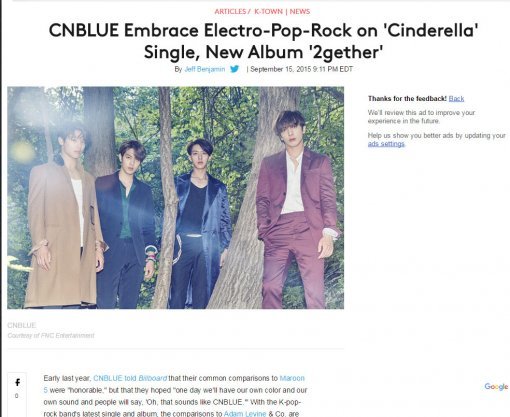 빌보드는 15일(이하 현지시간) K-POP 칼럼코너 K-TOWN을 통해 ‘씨엔블루가 신보 ‘투게더’와 타이틀 곡 ‘신데렐라’에서 일렉트로팝록을 아우르다(CNBLUE Embrace Electro-Pop-Rock on 'Cinderella' Single, New Album '2gether')’라는 제목의 칼럼을 게재했다.