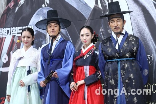 배우 한채아(왼쪽부터), 장혁, 김민정, 유오성이 16일 오후 서울 강남구 임피리얼 팰리스 호텔에서 열린 KBS2 새 수목드라마 ‘장사의 신-객주 2015’제작발표회에 참석해 포토타임을 하고 있다.