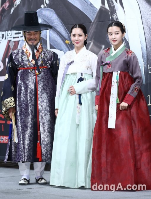 배우 이덕화(왼쪽부터), 한채아, 문가영이 16일 오후 서울 강남구 임피리얼 팰리스 호텔에서 열린 KBS2 새 수목드라마 ‘장사의 신-객주 2015’제작발표회에 참석해 포토타임을 하고 있다.