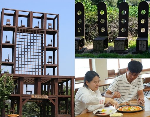 제주 낙천 아홉굿 마을에 있는 의자공원의 대형 조형물(맨 왼쪽사진)과 각각 고유의 이름이 있는 공원 의자들(우측상단). 낙천 아홉굿 마을의 대표적인 체험프로그램 보리피자 만들기(우측하단). 보리농사를 주로 하던 한적한 시골이던 낙천 아홉굿 마을은 여유 있는 휴식을 상징하는 의자를 테마로 한 공원 조성과 테마 이벤트로 새로운 지역 관광명소로 주목받고 있다. 제주|김재범 전문기자 oldfield@donga.com