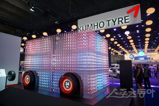 금호타이어가 2015 프랑크푸르트 모터쇼 신규 글로벌 전시부스 안에 대형 LED WALL을 설치하는 등 다양한 마케팅 활동을 전개하고 있다. 프랑크푸르트(독일)|원성열 기자 sereno@donga.com