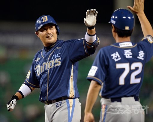 인생은 이호준처럼! NC 맏형 이호준(왼쪽)은 15일 마산 kt전에서 만루홈런을 날리며 3년 연속 20홈런을 달성했다. 그러나 그는 자신을 “야구 바보”라고 낮췄다. 스포츠동아DB
