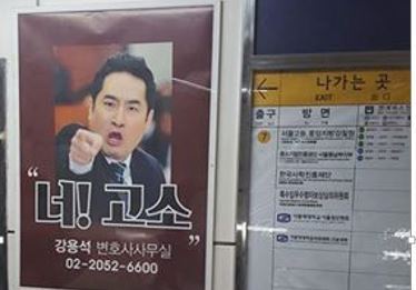 15일 서울 서초역 등에는 강용석 변호사 사무실의 이색적인 광고 포스터가 게재돼 눈길을 끌었다. 포스터에는 강용석 변호사의 사진을 배경으로 ‘너! 고소’란 문구와 사무실 연락처가 쓰여 있다.