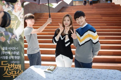 두 사람은 17일 오후 1시 드라마 촬영지인 경기도 이천시 청강문화산업대학교 캠퍼스에서 시청률 공약 이행 이벤트를 열었다.