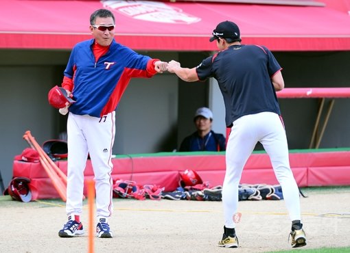 17일 광주 KIA챔피언스필드에서 '2015 타이어뱅크 KBO리그' KIA 타이거즈와 kt 위즈의 경기가 열린다. 경기전 KIA 김기태 감독과 kt 이대형이 하이파이브를 나누고 있다.