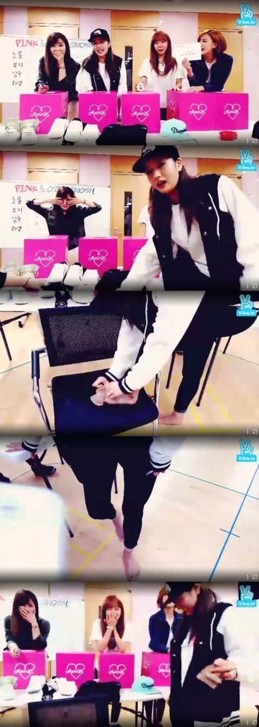 보미는 17일 네이버 V앱‘에이핑크 로또쇼 #2’에서 팬들이 보낸 미션 중 ‘양 발로 스타킹 3분 안에 벗기기’를 뽑았다.