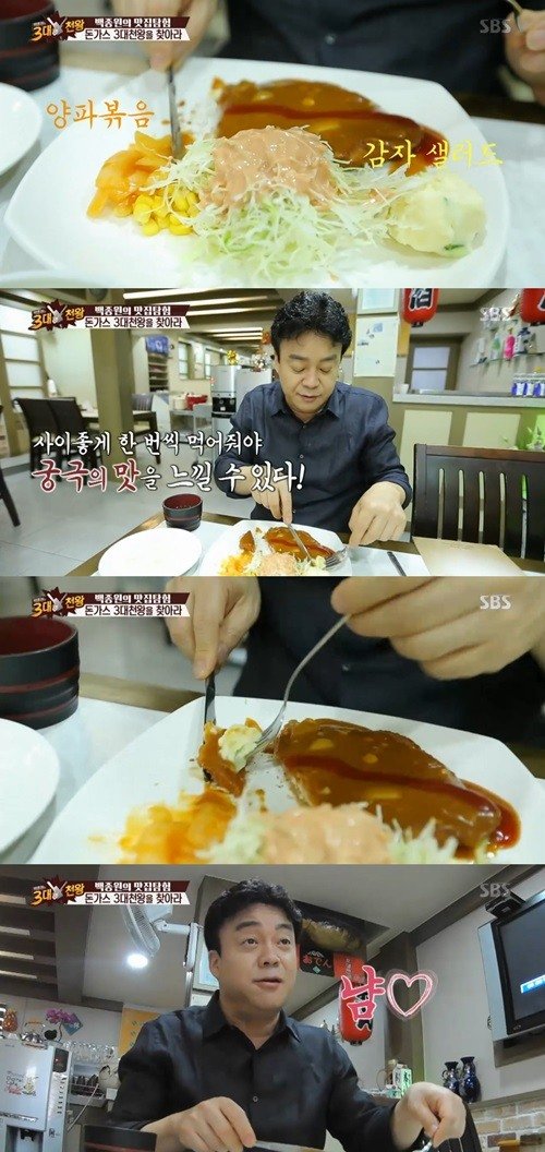 백종원은 돈가스와 함께 나온 감자샐러드와 볶은 양파를 곁들어 먹었다. 그중 감자 샐러드를 조금씩 떼어내 돈가스와 동시에 먹으며 그 맛이 바로 궁극의 맛이라고 극찬해 눈길을 모았다.