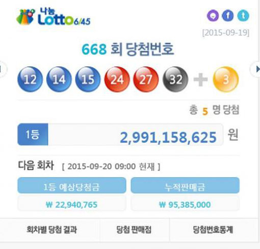 나눔로또는 19일 제668회 로또복권 추첨에서 당첨번호 6개를 모두 맞힌 1등 당첨자는 5명으로 29억9115만원씩 받는다고 발표했다.