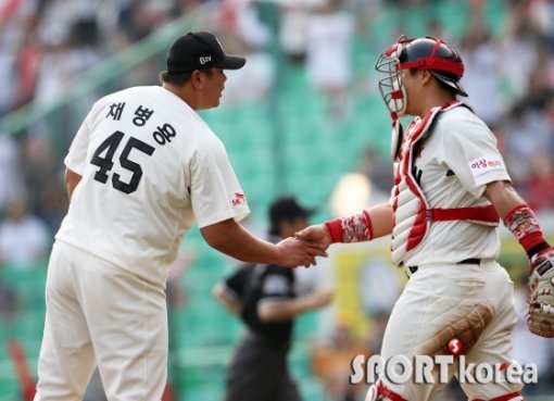 9회에 등판 삼자범퇴 시키며 경기를 마무리한 채병용, 정상호 배터리가 악수를 나누고 있다.