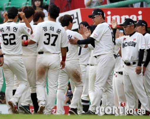 SK 3연승, 김용희 감독 선수들과 하이파이브