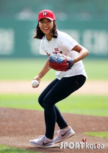 20일 오후 인천 SK행복드림구장에서 열린 ‘2015 타이어뱅크 KBO 리그 프로야구’ SK 와이번스와 KIA 타이거즈의 경기에서 프로골퍼 이미향이 시구하며 볼을 떨어뜨린 뒤 줍고 있다.