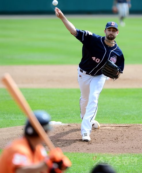 20일 대전 한화생명 이글스파크에서 ‘2015 타이어뱅크 KBO리그’ 한화 이글스와 두산 베어스의 경기가 열렸다. 두산 선발투수 니퍼트가 힘차게 볼을 던지고 있다.