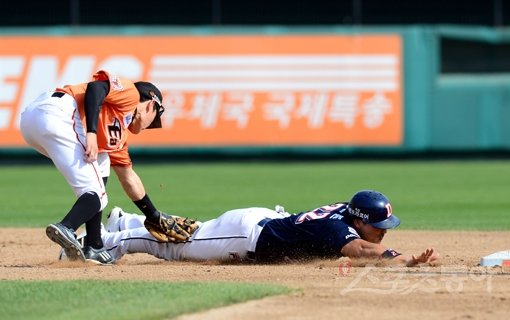 20일 대전 한화생명 이글스파크에서 ‘2015 타이어뱅크 KBO리그’ 한화 이글스와 두산 베어스의 경기가 열렸다. 3회초 2사 만루에서 두산 오재원의 적시타 때 1루주자 홍성흔이 2루에서 한화 강경학에게 태그아웃되고 있다.