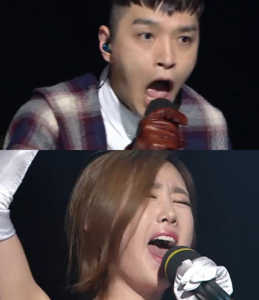 1라운드 두번째 대결은 ‘립스틱 짙게 바르고’와 ‘오매, 단풍들겄네’의 듀엣곡 대결이었다. 두 복면가수는 에코의 ‘행복한 나를’를 감미로운 목소리로 불러 판정단에게 감동을 줬다.