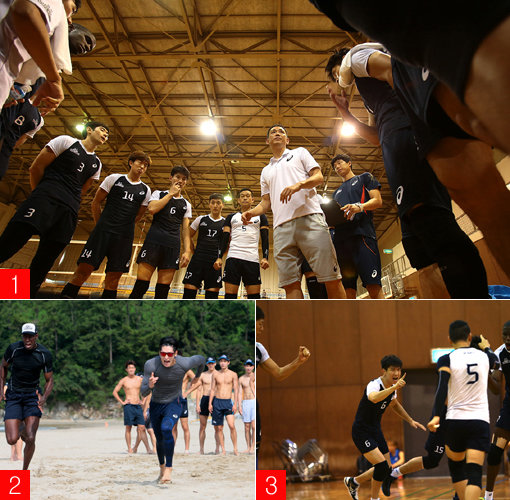 1. 현대캐피탈 최태웅 감독이 일본 전지훈련 도중 선수들에게 작전을 지시하고 있다. 지난 시즌 창단 후 처음으로 포스트시즌에 진출하지 못했던 현대캐피탈은 39세의 젊은 사령탑 최 감독이 몰고 올 변화의 바람을 기대하고 있다. 2. 현대캐피탈 외국인선수 오레올 카메호(왼쪽)와 문성민이 8월 남해 전지훈련 도중 송정솔바람해변에서 전력질주를 하고 있다. 3. 현대캐피탈 선수들이 일본 전지훈련 도중 파이팅을 외치며 분위기를 끌어올리고 있다. 사진제공|현대캐피탈
