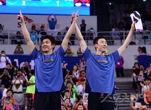 이용대-유연성은 20일 서울 송파구 올림픽공원 내 SK핸드볼경기장에서 열린 대회 마지막 날 남자복식 결승에서 세계랭킹 14위 김사랑(25)-김기정(26·이상 삼성전기)을 2-0(21-16 21-12)으로 꺾었다. 올해 국제대회 4번째 정상 등극이다.