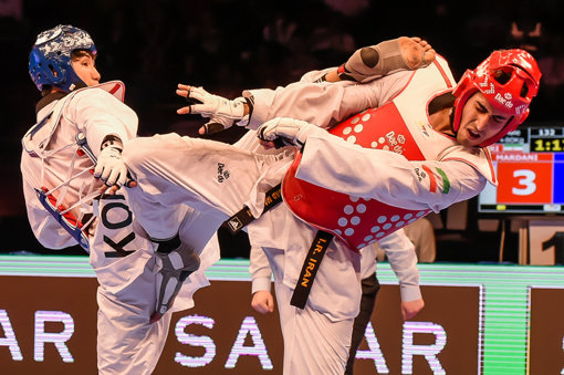 한국 조철호(왼쪽)가 19일(한국시간) 터키 삼순에서 열린 세계태권도연맹(WTF) 그랑프리 2차 대회 남자 +87kg급 결승전 도중 사자드 마르다니(이란)의 얼굴을 공격하고 있다. 사진제공|세계태권도연맹