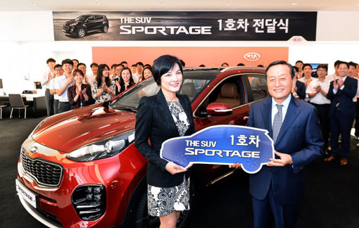 기아차는 18일 서울 압구정동 기아차 사옥에서 김창식 국내영업본부장(부사장)을 비롯한 임직원들이 참석한 가운데 민 상무에게 ‘The SUV, 스포티지’ 1호차를 전달하고 200만원 상당의 주유상품권을 증정했다.