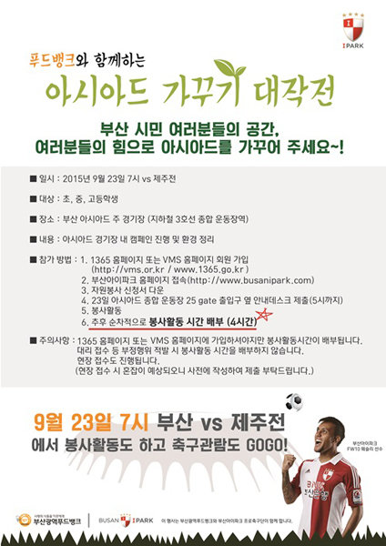 부산 아이파크는 23일 오후 7시 열리는 제주 유나이티드와의 홈경기에서 ‘푸드뱅크와 함께하는 아시아드 가꾸기 대작전’ 캠페인을 진행한다. 캠페인 참가자들은 오후 5시부터 아시아드주경기장과 인근에서 정화활동을 펼친다. 또 축구팬들을 대상으로 경기장내 금연 안내와 쓰레기 줄이기 운동을 함께 펼친다. 이번 캠페인에 참석하는 학생들에게는 총 4시간의 봉사활동 시간이 부여된다.