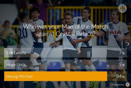 경기 후 토트넘 구단 홈페이지에서 진행된 이날 경기 최우수 선수(Man Of the Match) 투표에서도 토트넘 팬들의 84%가 손흥민을 선택하며 활약을 인정했다. 골키퍼 위고 요리스가 9%, 에릭 라멜라가 7%를 받았다.
