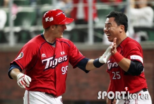 21일 오후 인천 SK행복드림구장에서 열린 `2015 타이어뱅크 KBO 리그 프로야구` SK 와이번스와 KIA 타이거즈의 경기에서 KIA 브렛필이 4회초 선두타자로 나와 SK 김광현의 초구를 잡아당겨 좌월 솔로홈런을 치고 홈인한 뒤 이범호와 하이파이브를 하며 기쁨을 나누고 있다.