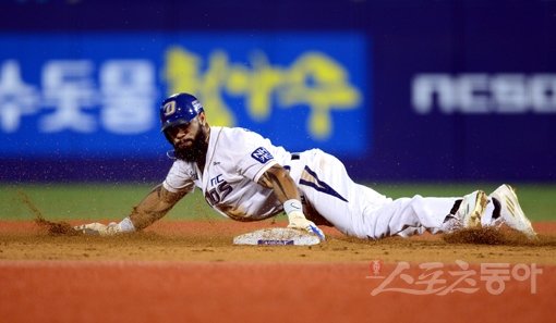 21일 창원 마산야구장에서 '2015 타이어뱅크 KBO리그' NC 다이노스 넥센 히어로즈의 경기가 열렸다. 4회말 2사 1루에서 NC 이호준 타석 때 1루주자 테임즈가 2루 도루에 성공하고 있다.
