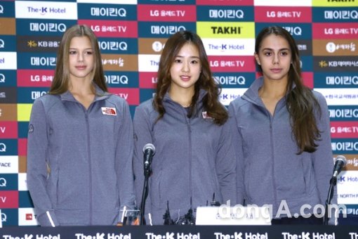 알렉산드라 솔다토바(왼쪽부터), 손연재, 마르가리타 마문 선수가 22일 오전 서울시 서초구 더케이호텔에서 열린 ‘메이킨Q 리드믹 올스타즈 2015’ 기자회견에 참석해 포토타임을 하고 있다.