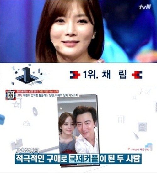 이날 방송에서 ‘월드클래스 남편을 만나 여왕처럼 사는 스타’ 1위에 중국배우 가오쯔치와 결혼한 채림이 올라 눈길을 끌었다.